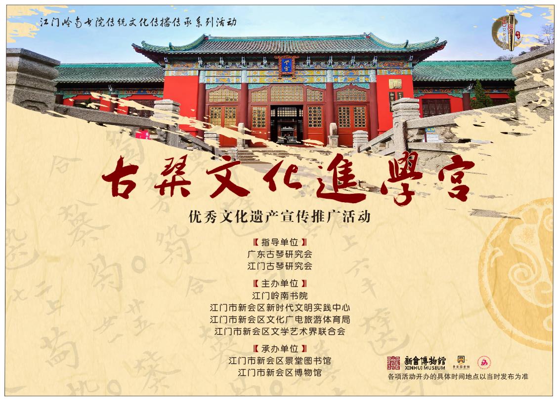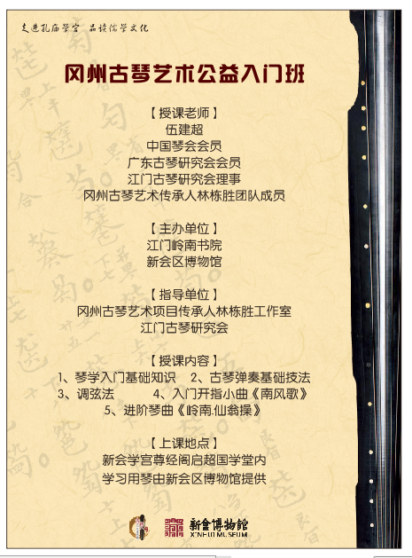 新会是古琴岭南派的发源地,冈州古琴艺术是新会优秀的非物质文化遗产项目。2020年以来,新会区博物馆“古琴文化进学宫”主题活动以多种形式宣传推广古琴艺术,相继推出雅集、展览、体验活动等多场古琴主题活动。为了更好地营造千年新会学宫的传统文化氛围,落实江门岭南书院(新会学宫)项目建设方案的部署,保护传承冈州古琴艺术项目文化遗产,提升新会地区古琴艺术的欣赏和学习氛围,满足古琴爱好者需求。2023年,新会区博物馆在江门岭南书院(新会学宫)项目的支持下,继续开办冈州古琴艺术公益入门培训班。具体安排如下: