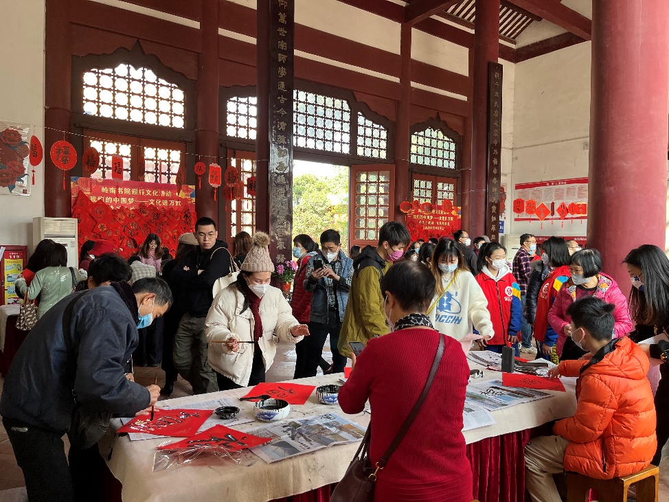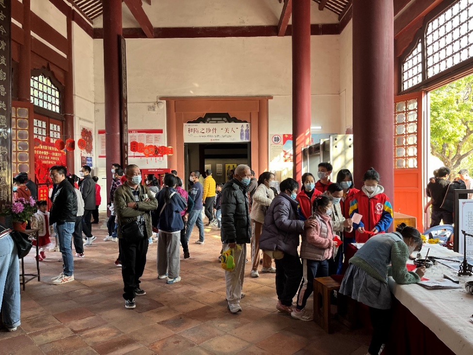 大年初一,学宫、书院内红红火火、喜气洋洋,迎来了一波接一波的参观热潮,游客前来学宫参观、祈福、许愿的热情高涨。新会区博物馆兔年春节“我们的中国梦——文化进万家”岭南书院系列文化活动精彩纷呈,群众参与度、满意度高。据统计,学宫、书院年初一全天接待游客总人数达3000人次,总体参观情况平稳、安全、有序。