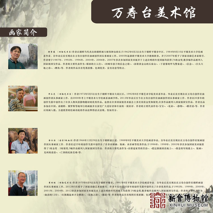 2016年5月07日,由中山大涌万寿台美术馆主办,新会区博物馆协办的《寻找自然的丽,自然的朴素—朝鲜名画家作品展》在学宫东廊展厅展出。展览展出包括朝鲜万寿台创作社顶级艺术家的朝鲜画、油画、高丽青陶瓷、刺绣等各类作品32件。作品加入了很多朝鲜民族的绘画元素和独特艺术理解,把线条广泛用作独特的表现手法,即使用一个线条也能精细的描绘出事物的动态和现象,深刻的表现出人物的心理状态,从画中感觉到一种画家对美丽自然的崇尚。展览时间为2016年5月7日—5月21日(逢星期一闭馆)。欢迎广大市民现场参观。